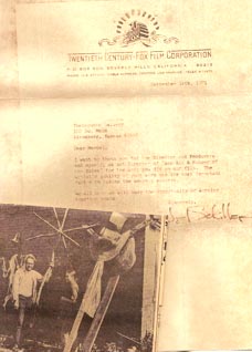 This letter which is so badly faded is from 20th Century Fox and was a letter thanking Mardel and I for the "work" we did for them. The bottom left hand cornor is a photo of us with the "work" we did which was to construct six scarecrows for the movie "Ace Eli and Rodger in the Sky". Part of the movie was shot east of Lindsborg in a field. We went out to watch the biplane land and take off in a stubble field which was great. In addition to being paid a lot of money for very little "work" we sold them a lot of stuff we had collected in the Old Brunswick Hotel. We owned a little art gallery called the