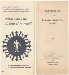 I was not a fan of the Viet Nam conflict when I got drafted. After serving as a Medical Instructor at Ft. Sam Houston I was convinced that the conflict was definitely evil. Upon returning to Kansas to finish school I decided to do everything I could to convince others to stay out of the draft. I am proud to say that a lot of the conversations I had resulted in guys finding legal ways to avoid participating in the conflict. I also met a couple of guys who were members of the War Resisters League, a liberal antiwar group from the east coast. I took it upon my self to purchase pamphlets and leave them in places where college students would find them. I also left them in restaurants, mens bath rooms, pinned up on community bulletin boards, hoping that a random scattering would glean a mind or two. No way to tell if it worked but at least I was not just sitting around talking like so many other left of center liberals. I am not a left of center liberal, but I do like to talk. |