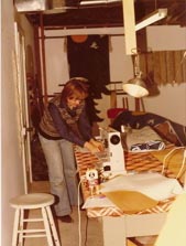 This is a view of the banner factory. M made a summer and a winter set of banners for the commercial area of downtown Salina. It was a great project, and a lot of work. Her Phaff sewing machine actually had grooves worn into the paint from the canvas sliding across into the sewing needle. She also ran the needle all the way through her finger which just happened to be her right hand so she could not reach the wheel on the right to lift the needle. I had to lift the needle and then hold it up and push her finger down with great gusto. |