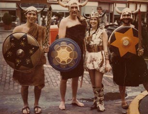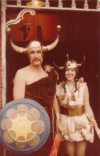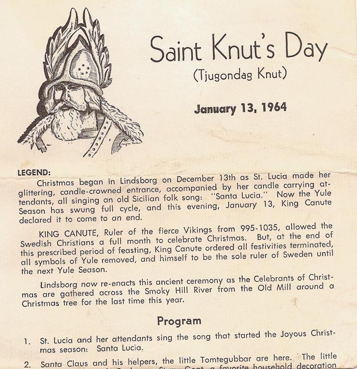 King Canute was a big deal in the 'borg. My Uncle Mox as usual was the instigator of having a celebration on the river on the 15th of January. It was cold. It was real cold. I was dressed in animal skins, but there were some rather important parts that did not have ANY covering. My feet were wrapped in rags and then rabbit skins. I had a bear rug (it had been a little bear) which was sort of tacked in a couple of places so it would stay wrapped around my body. They let us sit in the car until five minutes before the thing started. It started with a couple of Tomten (little elves) walking out onto the sandbar at the rivers edge, carrying torches. It was so cold that the speaker system froze and would not work so I had to walk right up to the edge of the frozen solid river and yell in Swedish. "Everyone back to work Christmas is over today." A couple of other Tomten carried a couple of Christmas trees over to the already ten foot tall pile and the torches were flung into the pile. That was the best part of the whole deal the dried out evergreen trees went up like paper soaked in gasoline. Come to think of it my Uncle probably used a little gasoline. The Television news guys from Wichita were there, they had kept the cameras in the vans until the torches appeared. My moustache had ice on it just from breathing. The only thing that kept me from freezing to death was watching King Canute's queen who had fewer skins on then I did. The rabbit skins kept sliding off of her shoulders. We ended up doing King Canute for the Hyldings Fest parade that next year in October. It was to be a prelude to the next King Canute Day on January 15th. |