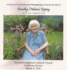 I was back in Olsburg for my cousin Wesley Quinton's funeral. One of his daughters preformed the service. She's a Lutheran Pastor up in the Dakotas. All of the remaining Espings were there and it allowed me to see my own mortality closing in from behind. The Bjorlings were there. the Sislers, Earl, his sister Cecelia and her husband, Woody and family and all the Nelsons. We walked to the cemetery, but this time we went to the one on the north of the road. It is the reinterred graves from Maridahl. Our great and glorious government couldn't find the money to move Maridahl Church, when they decided to dam the river and flood the church grounds. The oldest Lutheran Church west of the Mississippi. A lot of bad feelings about that. The first setlement of Swedes in Kansas. The farmers up their bought a guy a rifle to shoot at the engineers while they were trying to build the dam. I think they were some of the Norwegians. |