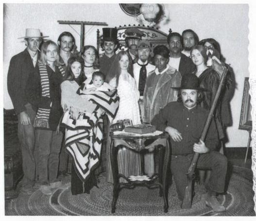 Those listed from left ------- SNOW, his Wife? Paul Clopton in front is his wife with child. Wife deceased Top Hat Roger Jamisson Wife at the time slightly to left and in front of him Gretchen Coles Les Crook with Stan Dahlsten in front and his then wife slightly to left Linda Fuller Art Quallo and his wife at the time slightly to left. Mark Esping Wife Mardel with parrot and Karla Crook behind Ron Myrick Picture taken at the Old Mill by Dale Hoag he printed the cards and only charged us for the number of cards we wanted. Taken at the Old Mill Museum. |