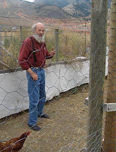 Well here is a picture of the double fence chicken yard. The garden is behind Tuck. I shot the photo through the first fence. I didn't get to eat any chicken. I saw about twenty chickens, and they all looked healthy. A new inovation is the addition of cloth material on the bottom three feet of the second fence. This means that if a real fast grasshopper aludes the chickens he has to make a three foot jump up to get high enough to jump through the fence into the garden. The only problem I see is that the grasshoppers who make it through the chicken run and make the three foot high final jump are automatically self selected to have the genetic material that will make their next generation super hoppers.